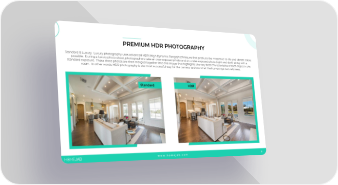 PREMIUM HDR PHOTOGRAPHY Standard & Luxury. Luxury photography uses advanced HDR (High Dynamic Range) techniques that produce the most true-to-life and vibrant colors possible. During a luxury photo shoot, photographers take an over-exposed photo and an under-exposed photo (light and dark) along with a standard exposure. These three photos are then merged together into one image that highlights the very best characteristics of each object in the room. In other words, HDR photography is the most successful way for the camera to show what the human eye naturally sees. Standard HDR www.homejab.com 6