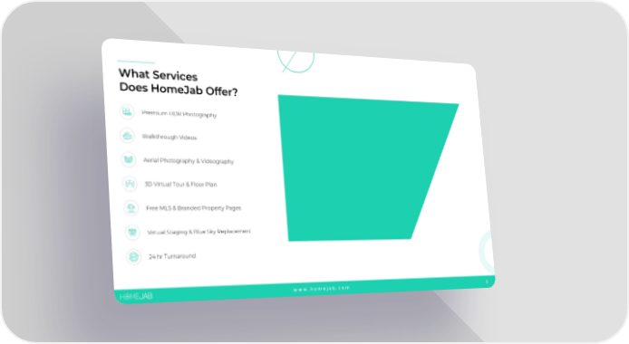 What Services Does HomeJabOffer? Premium HDR Photography Walkthrough Videos Aerial Photography & Videography 3D Virtual Tour & Floor Plan Free MLS & Branded Property Pages Virtual Staging & Blue Sky Replacement 24 hr Turnaround www.homejab.com 5 HomeJab Proposal Page 4 Page 6Video Player is loading.Play VideoPlaySkip BackwardSkip ForwardMuteCurrent Time 0:00/Duration -:-Loaded: 0%0:00Stream Type LIVESeek to live, currently behind liveLIVERemaining Time --:- 1xPlayback RateChaptersChaptersDescriptionsdescriptions off, selectedCaptionscaptions settings, opens captions settings dialogcaptions off, selectedAudio TrackPicture-in-PictureFullscreenThis is a modal window.The media could not be loaded, either because the server or network failed or because the format is not supported.Beginning of dialog window. Escape will cancel and close the window.TextColorWhiteBlackRedGreenBlueYellowMagentaCyanOpacityOpaqueSemi-TransparentText BackgroundColorBlackWhiteRedGreenBlueYellowMagentaCyanOpacityOpaqueSemi-TransparentTransparentCaption Area BackgroundColorBlackWhiteRedGreenBlueYellowMagentaCyanOpacityTransparentSemi-TransparentOpaqueFont Size50%75%100%125%150%175%200%300%400%Text Edge StyleNoneRaisedDepressedUniformDrop shadowFont FamilyProportional Sans-SerifMonospace Sans-SerifProportional SerifMonospace SerifCasualScriptSmall CapsResetDoneClose Modal DialogEnd of dialog window.Opens FullscreenOpens Fullscreen